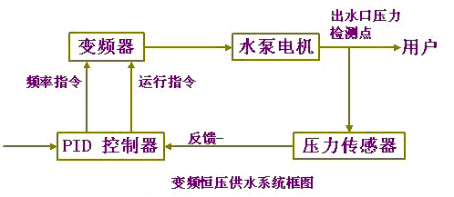 变频恒压供水系统采用一电位器设定压力(也可采用面板内部设定压力),采用一个压力传感器(反馈为4~20mA或0-10V)检测管网中压力,压力传感器将信号送入变频器PID回路,PID回路处理之后,送出一个水量增加或减少信号,控制马达转速。如在一定延时时间内,压力还是不足或过大,则通过PLC作工频/变频切换,使实际管网压力与设定压力相一致。另外,随着用水量的减少,变频器自动减少输出频率,达到了节能的目的。